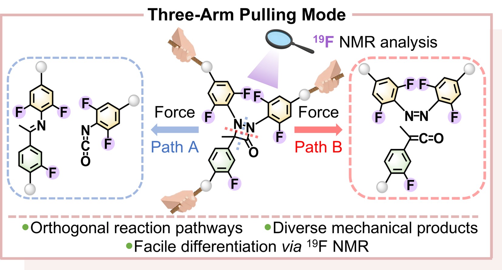 然而,在大多数体系中,机械力通常通过两条力臂传递,力敏分子在受力时往往沿单一反应路径发生转化。如何在同一分子中同时激活多条力化学反应路径仍具有挑战性。针对这一问题,复旦大学千海课题组设计了一类含氟1,2-二氮杂环丁酮力敏分子,并提出三臂拉伸策略,在单一分子骨架中实现两条正交力化学反应路径的同步激活。研究表明,该力敏分子在受力条件下可分别沿两条反应路径发生裂解:路径A生成亚胺和异氰酸酯,路径B生成偶氮苯和烯酮。相关初级产物还可进一步发生甲醇捕获、水解或受力异构化等转化,从而形成更加丰富的产物体系。为了实现对复杂力致产物的清晰识别,研究人员在分子结构中引入氟原子标记,并利用19F NMR对反应产物进行分析。相较于1H NMR和13C NMR,19F NMR具有更高的谱图分辨率,使研究人员能够在同一体系中同时识别多种力化学产物并实现定量分析。实验结果表明,在三臂体系中,两条反应路径的内在反应性与对应的双臂体系保持一致,其中N–N键断裂路径始终更为有利。