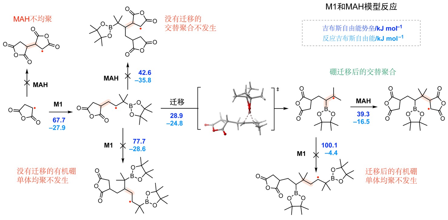 为了阐明其内在机理,研究团队结合了模型反应与密度泛函理论计算。通过三氟甲基自由基引发M1的模型反应,成功捕获了1,2-硼迁移后的产物,直接验证了该关键步骤的存在。DFT计算进一步揭示了反应的能量路径(图2)。计算表明,对于成功的单体M1,1,2-硼迁移将不稳定的仲碳自由基转化为更稳定的叔碳自由基,该过程在动力学和热力学上均高度有利,其速率远超与单体直接加成。迁移后生成的亲核自由基对缺电子的MAH的加成速率极高,确保了严格的交替序列。